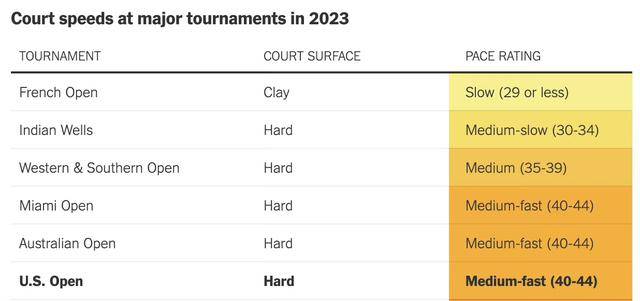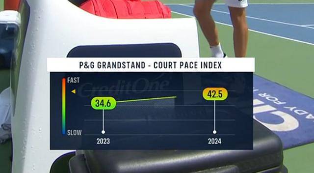 大家可能对此没有什么概念,但是不知道大家还记不记得阿尔卡拉斯在辛辛那提输给孟菲尔斯后抱怨场地球速过快?众所周知,辛辛那提是巡回赛中被公认的最快场地之一,而从数据上来看,今年的辛辛那提场地的平均速度指数已经高达42.5,这个指数的球速让很多球员几乎无法完成完整的动作。因此可以想象,今年美网的情况和辛辛那提非常相似。