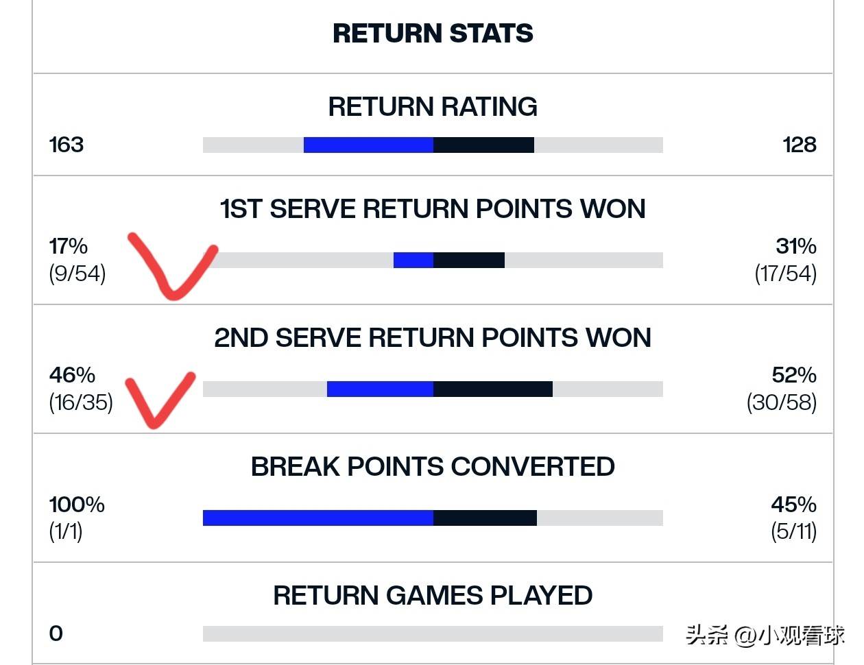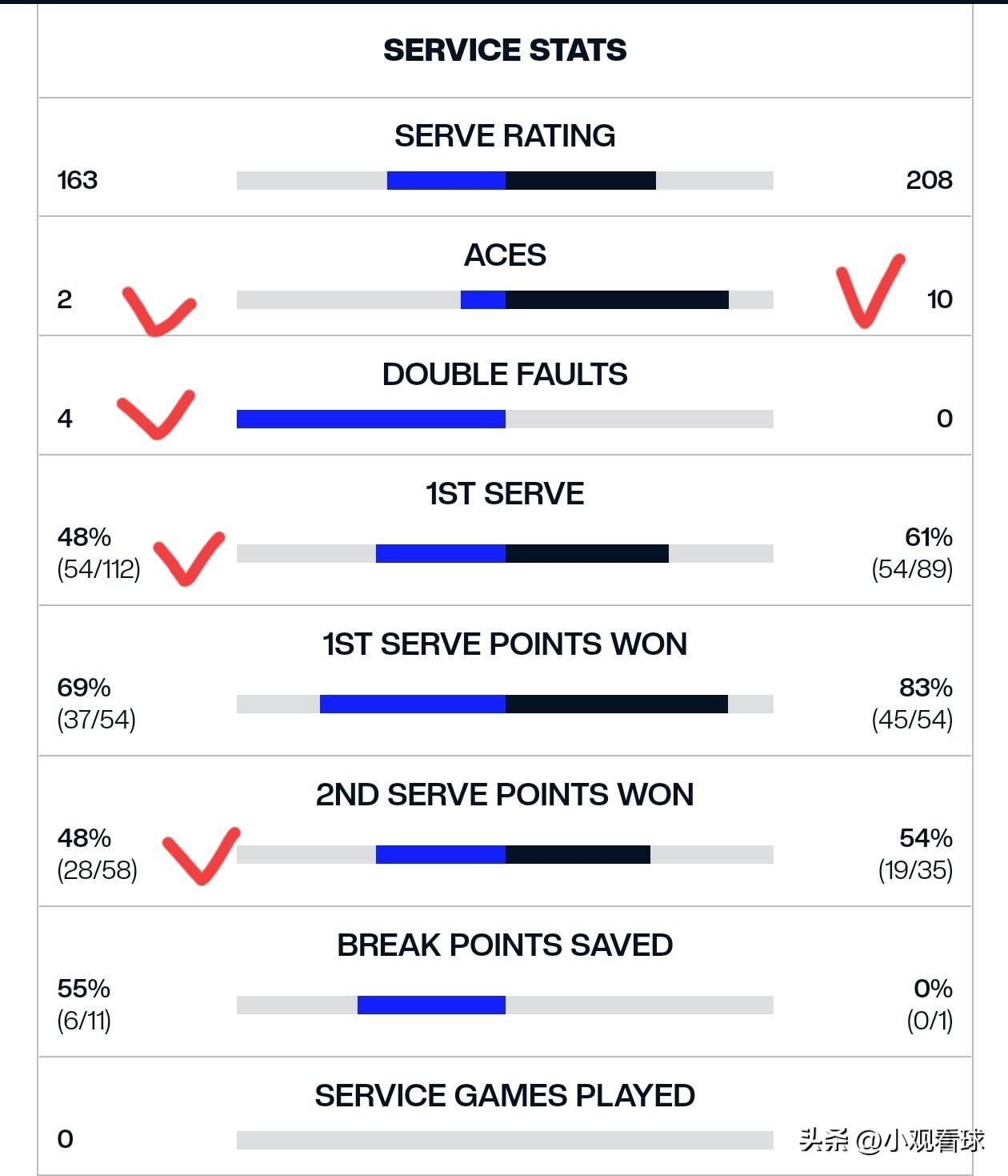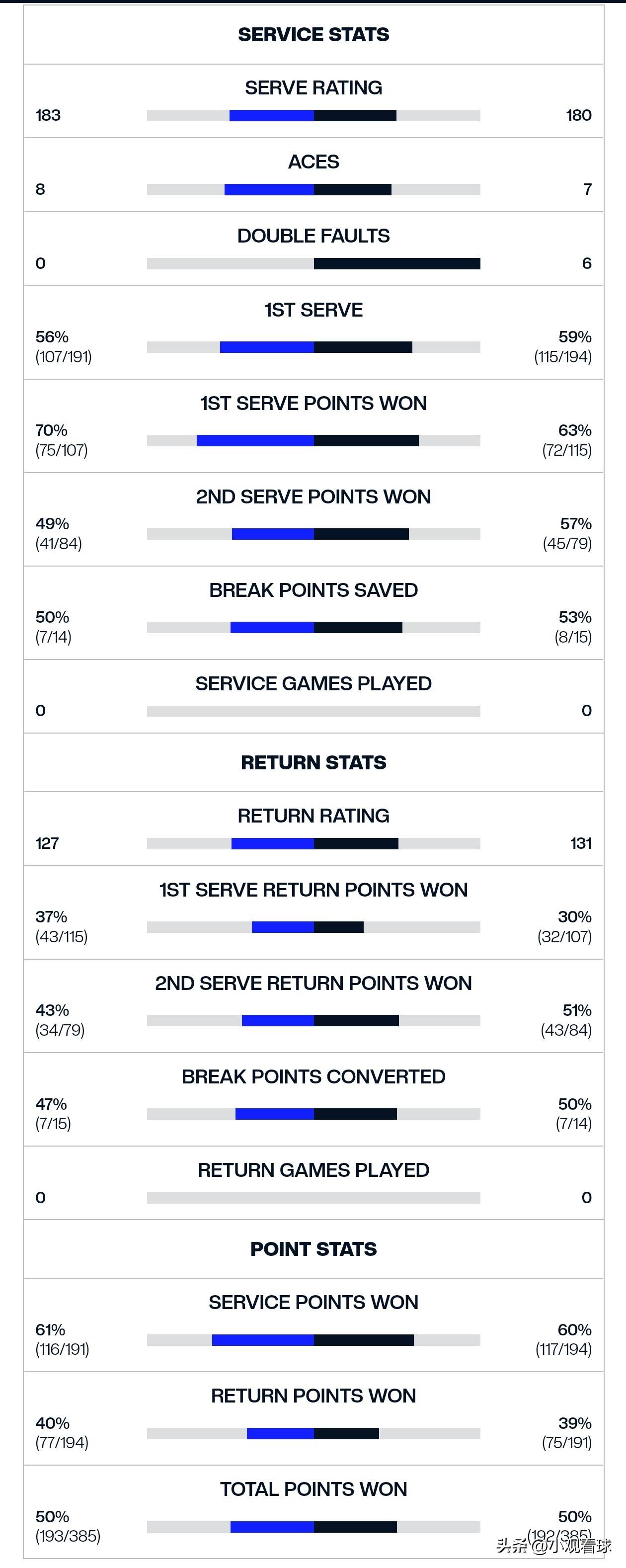比赛伊始,纽约法拉盛公园的夜场灯光下,两位选手的状态就呈现出鲜明对比。辛纳的发球环节出现了灾难性,整场比赛他的一发进球率仅有48%(54/112),远低于他本赛季平均62%的水平。更令人担忧的是,他的一发得分率也跌至69%,二发得分率更是只有48%。与之形成强烈反差的是,阿尔卡拉斯保持着61%的一发进球率和83%的一发得分率,全场轰出10记ACE球且零双误。这种发球端的巨大差距,让辛纳在每一个发球局都如履薄冰,而阿尔卡拉斯则能轻松保发。