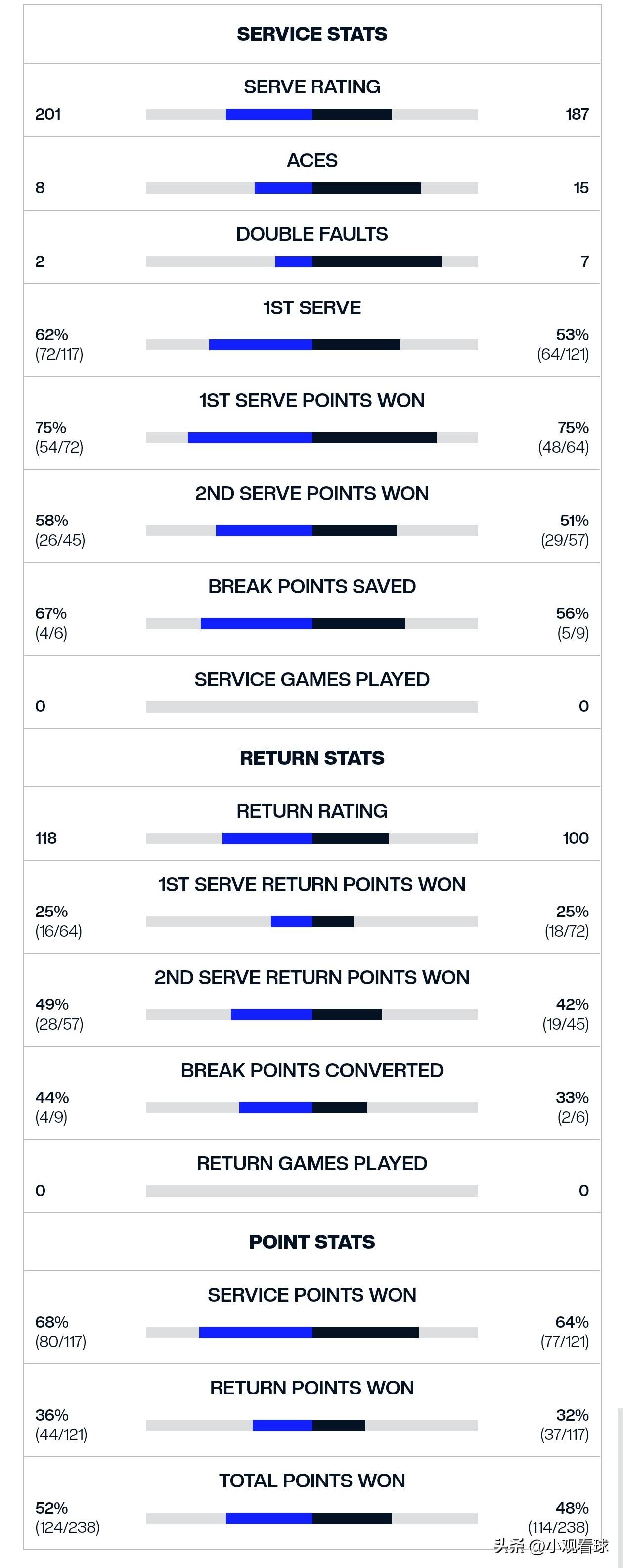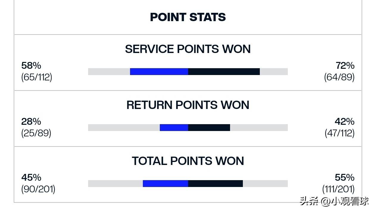 赛后技术统计揭示出更深层次的问题。与今年温网和法网的数据对比,辛纳在美网的表现堪称断崖式下滑。在温网,他的一发得分率高达75%,接发得分率36%,总得分率52%;而本次美网这三项数据分别下滑至69%、28%和45%。这种全方位的退步不禁让人怀疑:是身体状态不佳?还是技战术被完全破解?